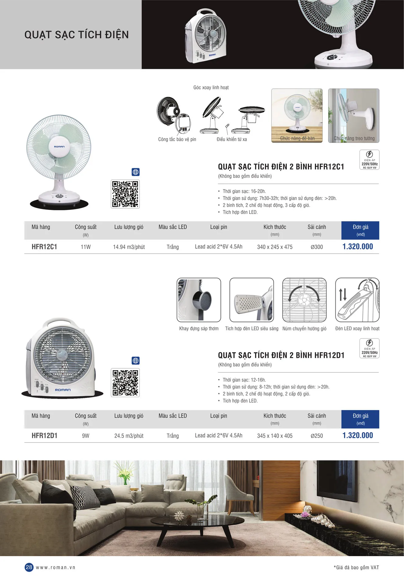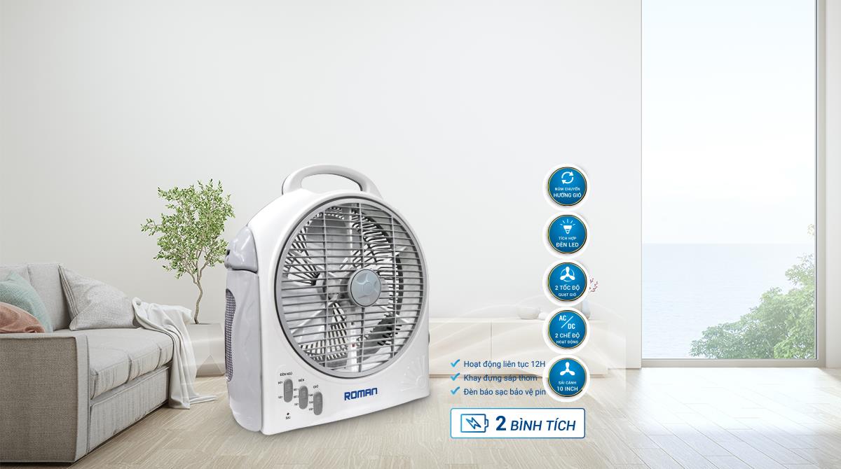 Quạt sạc tích điện Roman HFR12D1 mang đến trải nghiệm tuyệt vời dành cho người dùng với thiết kế đặc biệt 2 bình tích điện cùng nhiều tính năng tiện lợi, hấp dẫn khác.