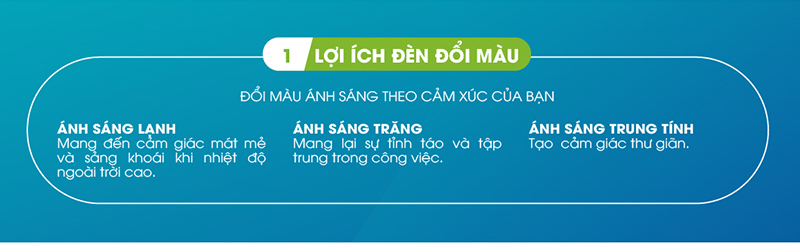 - Đèn có tính năng đổi 3 màu ánh sáng, tăng giá trị sử dụng cho người dùng 1 đèn tương đương 3 đèn. Đổi màu ánh sáng - đổi màu cảm xúc.