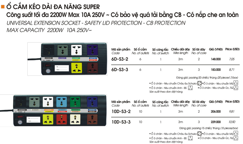 Công suất tối đa 2200W Max 10A 250V ~ có bảo vệ quá tải bằng CB - có nắp che an toàn.