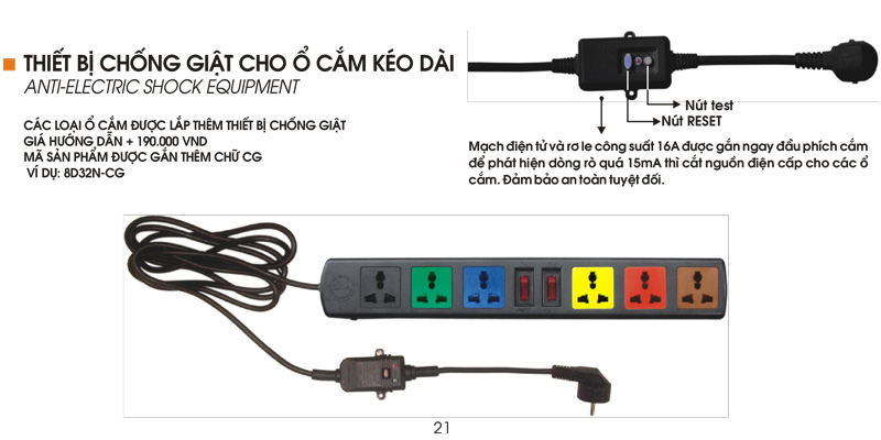- Thiết bị chống giật: Mạch điện tử và rơ le công suất 16A được gắn ngay đầu phích cắm để phát hiện rò quá 15mA thì cắt điện cấp cho các ổ cắm. Đảm bảo an toàn tuyệt đối.