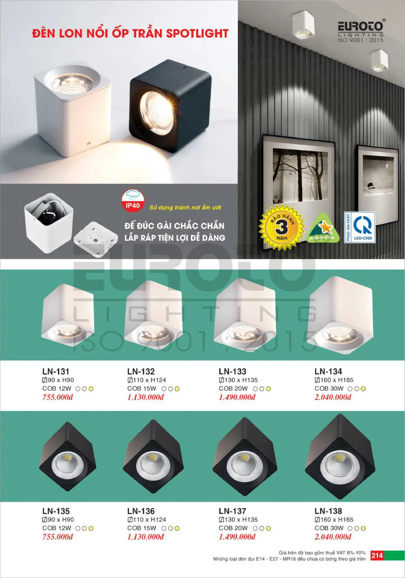 Đèn Lon Nổi Euroto LN-138 ⍁160 x H165 30W 1.224.000 VND 2.040.000 VND -40% Giá ưu đãi tốt hơn khi báo giá số lượng nhiều Mã sản phẩm LN-138 Thương hiệu Euroto Danh mục Đèn ốp nổi vuông (Euroto) Phân loại Đèn gắn nổi hộp vuông Bảo hành 12 tháng (Theo hãng) Xem Catalogue Đèn EUROTO 2026 Chọn số lượng và Thêm vào giỏ để đặt hàng. Hoặc gửi báo giá nếu số lượng nhiều. 1 2 3 4 5 6 7 8 9 10+ Số lượng Số lượng CHỌN SẢN PHẨM BÁO GIÁ NHANH Hướng dẫn đặt hàng | Bảo hành & Đổi trả Chỉ đường trên Google Maps HỖ TRỢ ĐẶT HÀNG/BÁO GIÁ Thứ 2 - Thứ 7 (7h30 - 17h) Lê Loan0769177877 Gọi điện Nhắn tin Thanh Quy0909617877 Gọi điện Nhắn tin Đặng Hồng Thái0938397877 Gọi điện Nhắn tin THÔNG SỐ KỸ THUẬT ⍁160 x H165 COB 30W 3000K - 4000K - 6500K Loại : Đèn gắn nổi hộp vuông