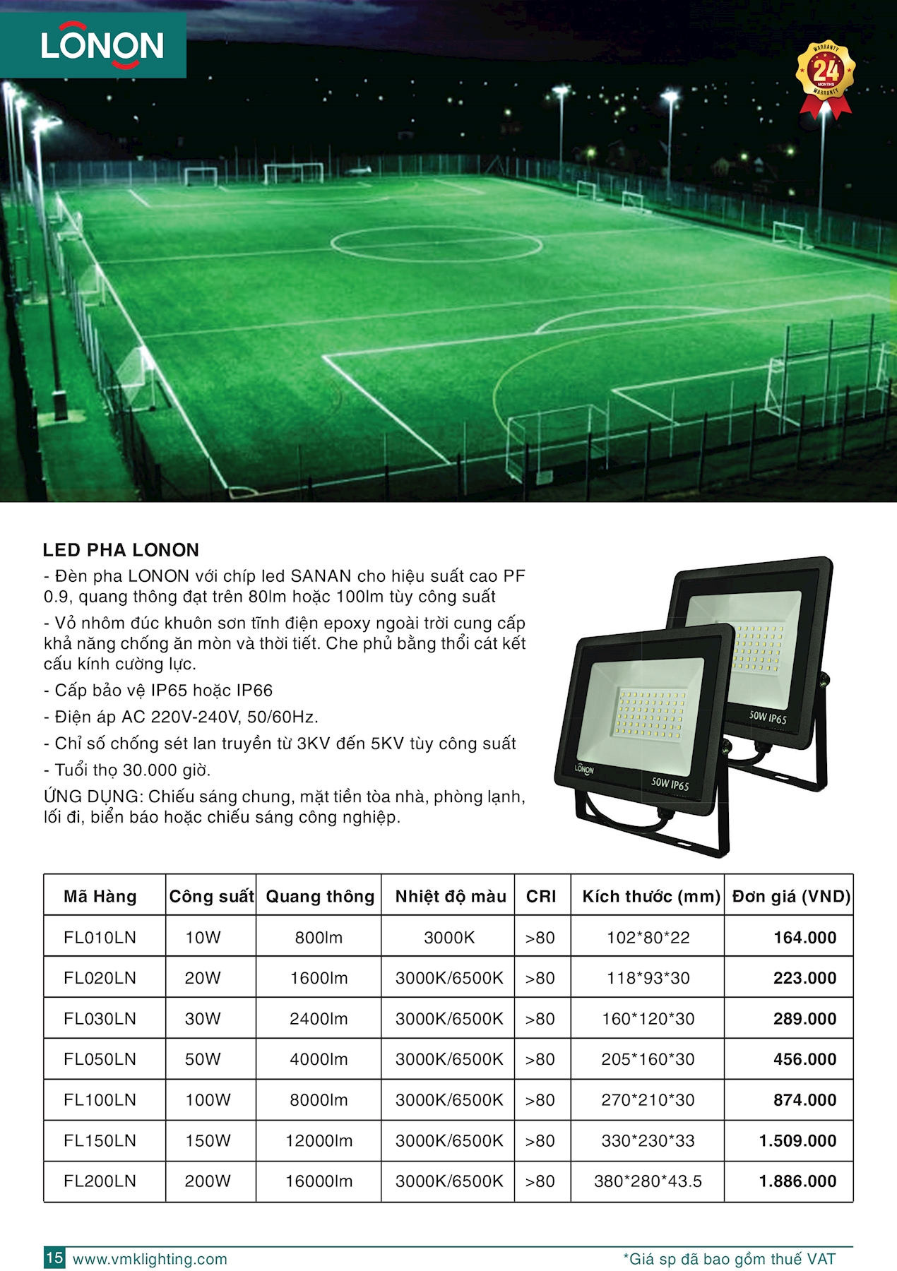 150W - Ánh sáng trắng (6500K) | FL0150LN | 1.509.000 | 30% | 1.056.300 |