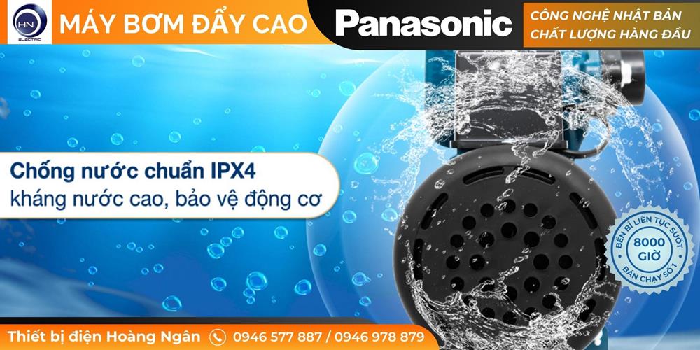 - Kháng nước cao, Bảo vệ động cơ: Máy bơm đẩy cao Panasonic được sản xuất theo tiêu chuẩn chống nước IPX4, có thể kháng nước hiệu quả khi gặp sự cố nước bắn vào, điều này giúp bảo đảm an toàn cho động cơ khi hoạt động trong môi trường ẩm ướt.