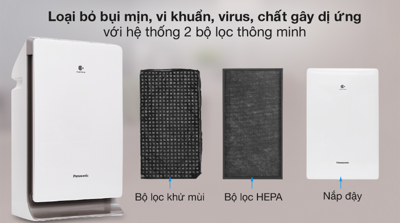 Máy lọc không khí Panasonic trang bị bộ lọc khử mùi và bộ lọc HEPA. Bộ lọc khử mùi công nghệ Super Nano giúp khử hiệu quả các mùi hôi như khói thuốc hay mùi thức ăn, cho không khí trong lành.
