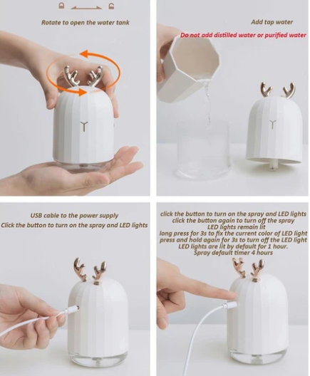 5. Hoạt động dễ dàng: cắm dây sạc đèn có điện, nhấn nút bắt đầu phun và tạo hiệu ứng phun sương.
