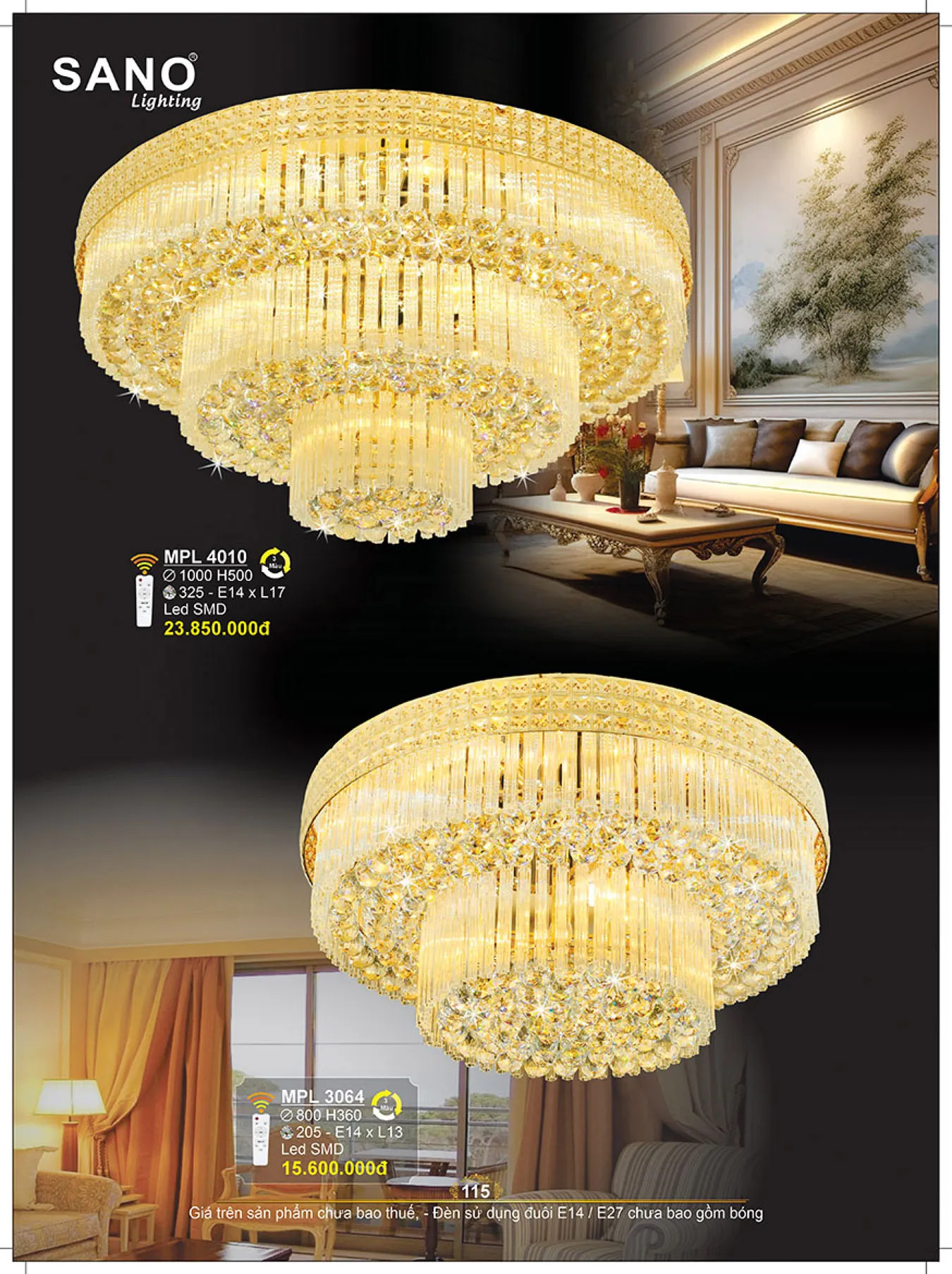 Đèn mâm ốp trần pha lê Sano Ø1000xH500mm E14x13 Led SMD remote