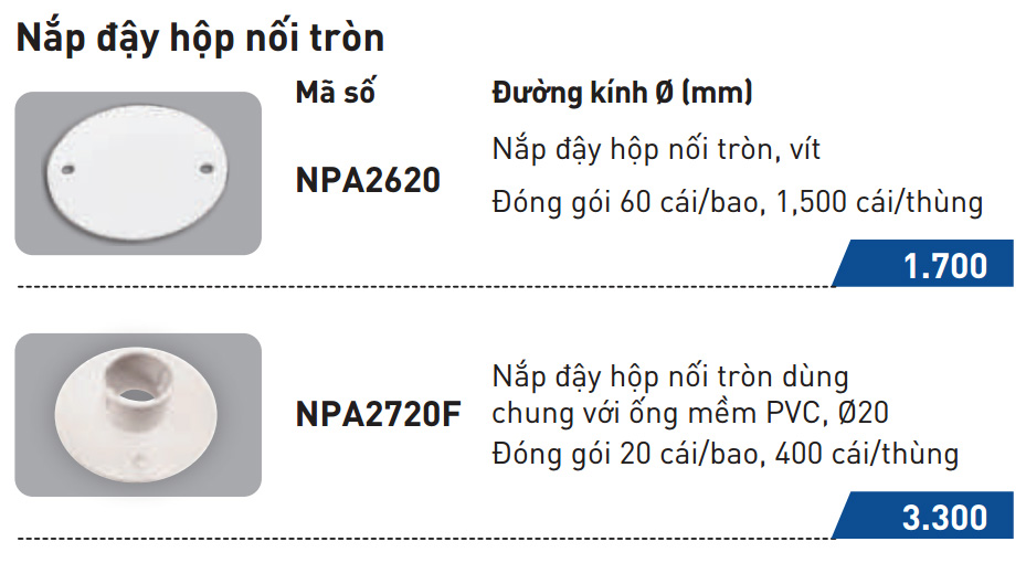 | NPA2720F | Nắp đậy hộp nối tròn dùng chung với ống mềm PVC, Ø20 | 20 cái/bao; 400 cái/thùng |