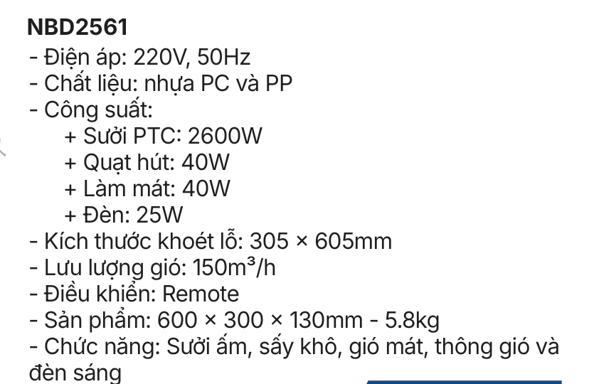Quạt hút sưởi Nanoco NBD2561 2.210.000 VND 3.250.000 VND -32% Giá ưu đãi tốt hơn khi báo giá số lượng nhiều Mã sản phẩm NBD2561 Thương hiệu Nanoco Danh mục Quạt hút sưởi (Nanoco) Phân loại Quạt hút Bảo hành bảo hành điện tử (Theo hãng) Xem Bảng giá Nanoco 2026 Chọn số lượng và Thêm vào giỏ để đặt hàng. Hoặc gửi báo giá nếu số lượng nhiều. 1 2 3 4 5 6 7 8 9 10+ Số lượng Số lượng CHỌN SẢN PHẨM BÁO GIÁ NHANH Hướng dẫn đặt hàng | Bảo hành & Đổi trả Chỉ đường trên Google Maps HỖ TRỢ ĐẶT HÀNG/BÁO GIÁ Thứ 2 - Thứ 7 (7h30 - 17h) Thanh Quy0909617877 Gọi điện Nhắn tin Lê Loan0769177877 Gọi điện Nhắn tin Đặng Hồng Thái0938397877 Gọi điện Nhắn tin THÔNG SỐ KỸ THUẬT Quạt hút sưởi Nanoco NBD2561 Hoặc xem thêm tại website: https://quattrandgp.vn/nanoco