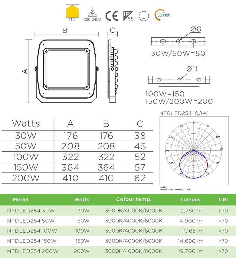 – Dải công suất rất đa dạng: 30W 50W 100W 150W 200W. Phù hợp cho nhiều nhu cầu chiếu sáng từ trung bình đến công suất cao.