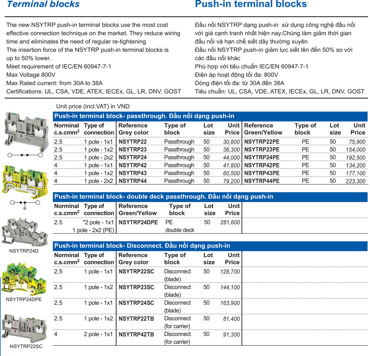 - Đầu nối NSYTRP dạng push-in sử dụng công nghệ đầu nối Với giá cạnh tranh nhất hiện nay.
