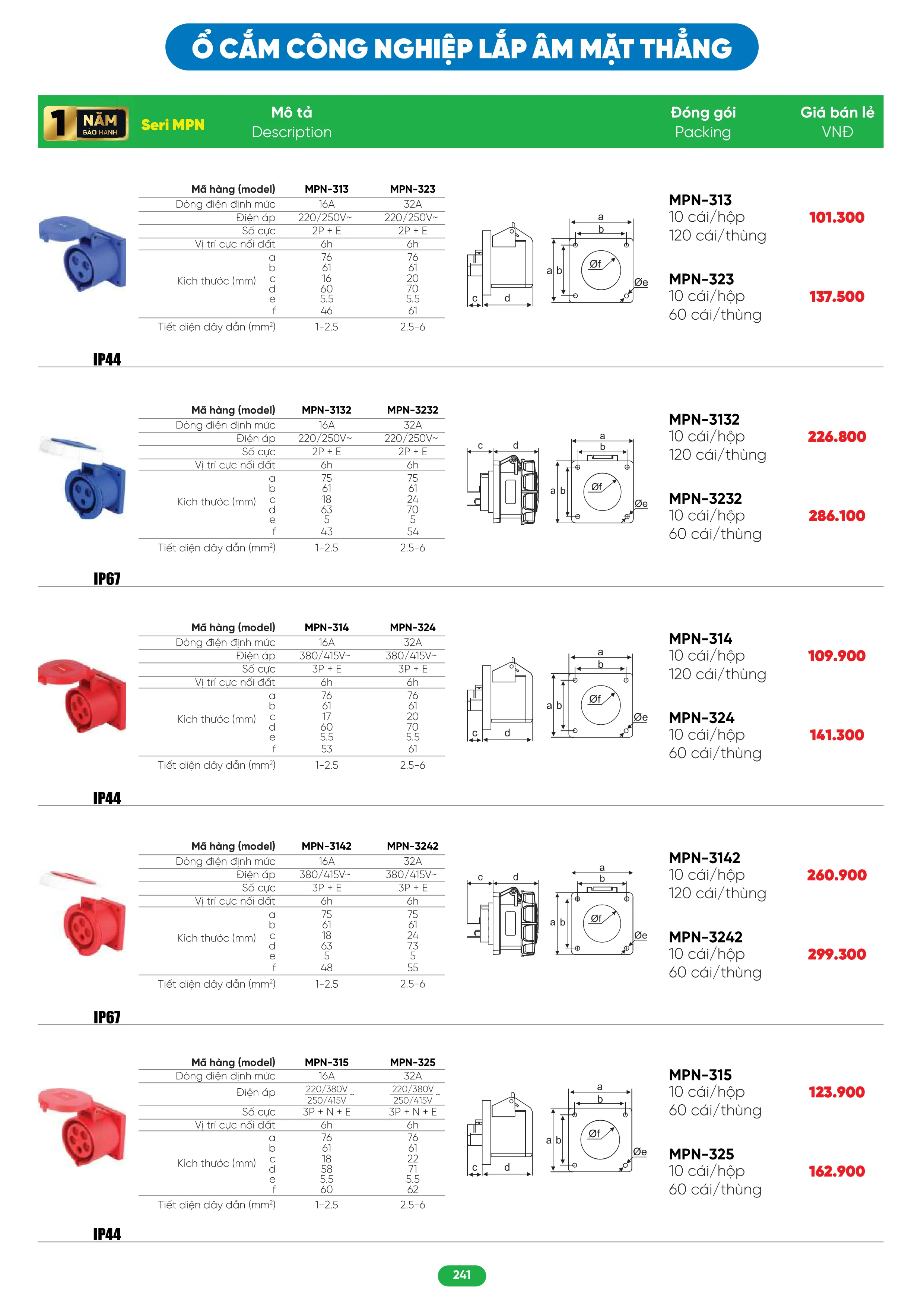 MPN-313 - Ổ cắm công nghiệp 1 pha MPE loại cố định bắt trên bảng điện 240V 2P+E IP44