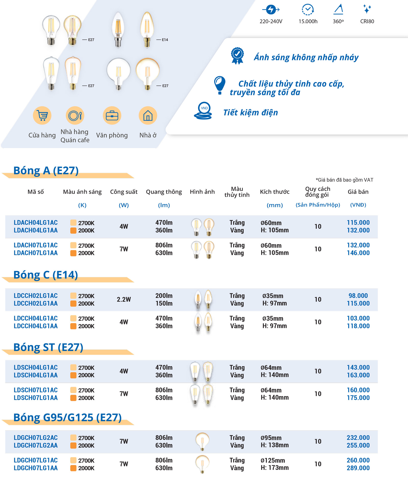 | Stt | Ảnh | Mẫu | Mã | Quang Thông | Kích Thước (ØxH) | Giá list (VND) |