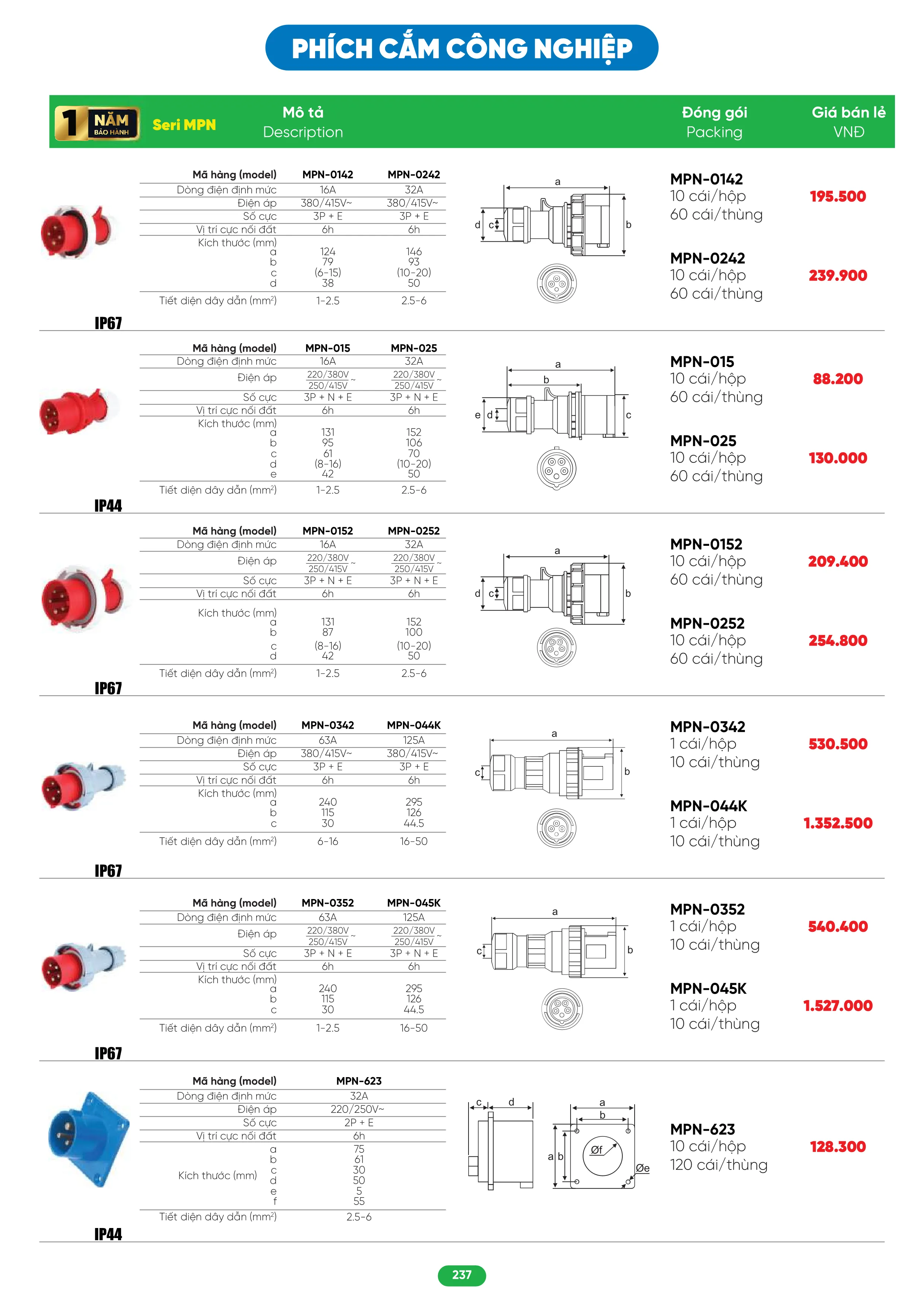 MPN-015 - Phích cắm công nghiệp 3 pha MPE loại di động IP44