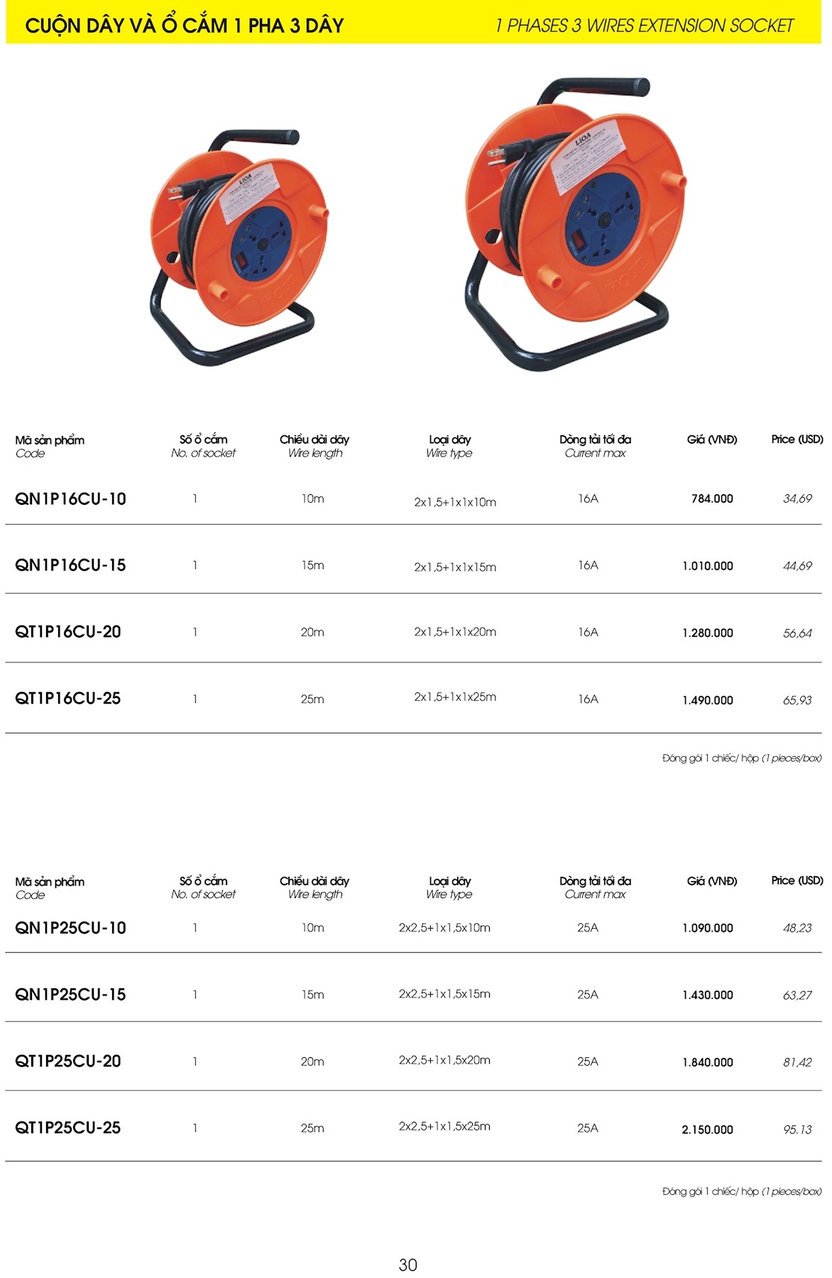 Loại 1P - 25A, dây dài 25m | QT1P25CU-25 | 2.150.000 | 20% | 1.720.000 |
