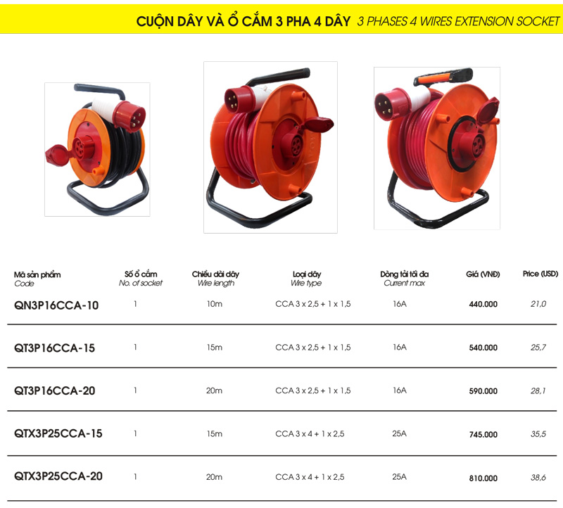 Ổ cắm kéo dài quay tay Rulo cuộn dây và ổ cắm 3 pha 4 dây 10 mét, 16A