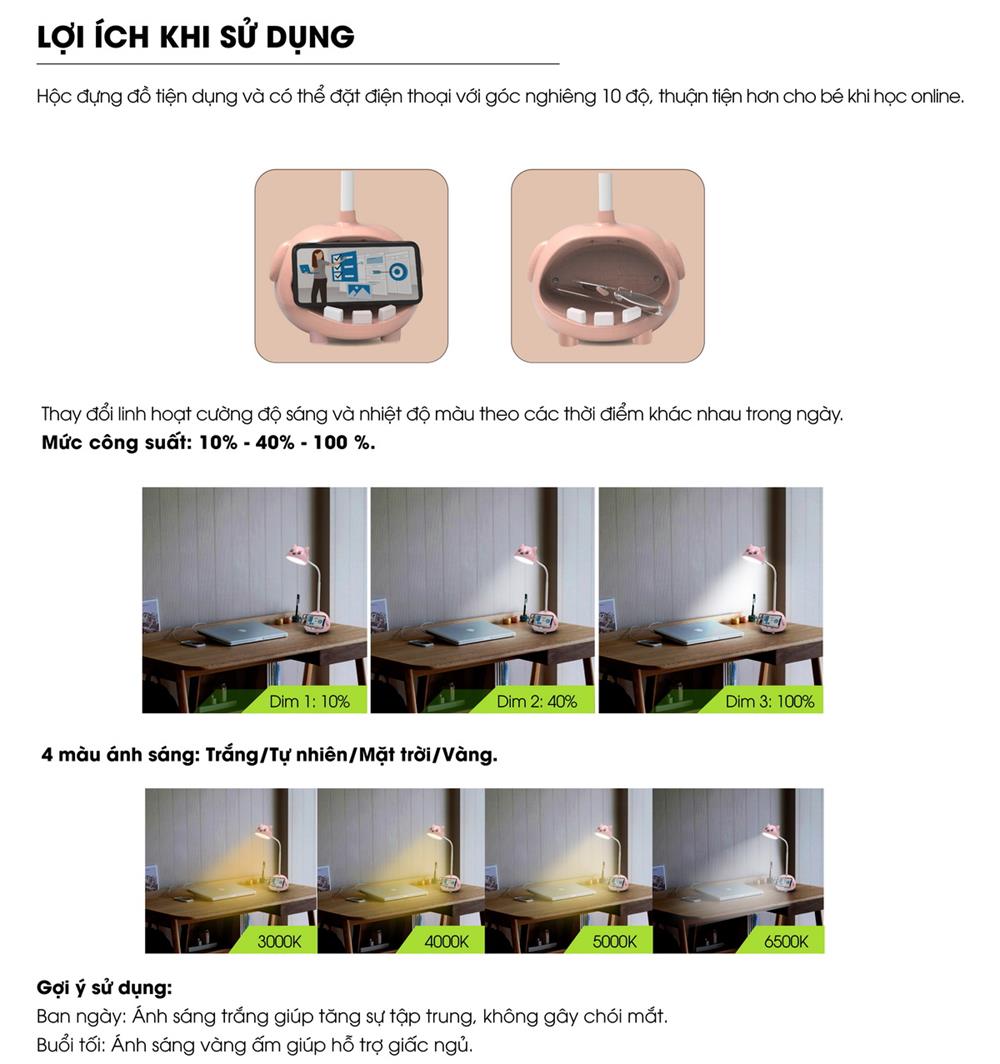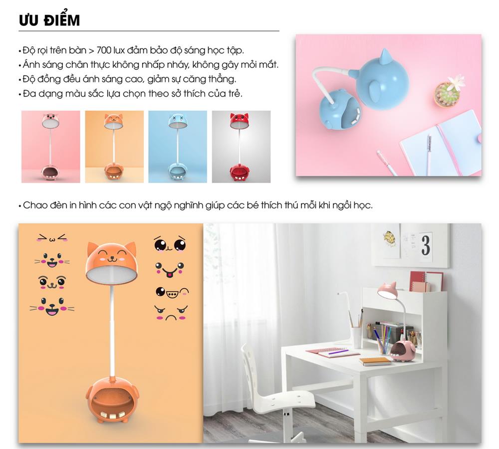 - Đèn sử dụng vật liệu nhựa ABS, màu sắc phong phú. Chao in hình con vật ngộ nghĩnh đáng yêu giúp các bé thích thú mỗi khi ngồi học bài.