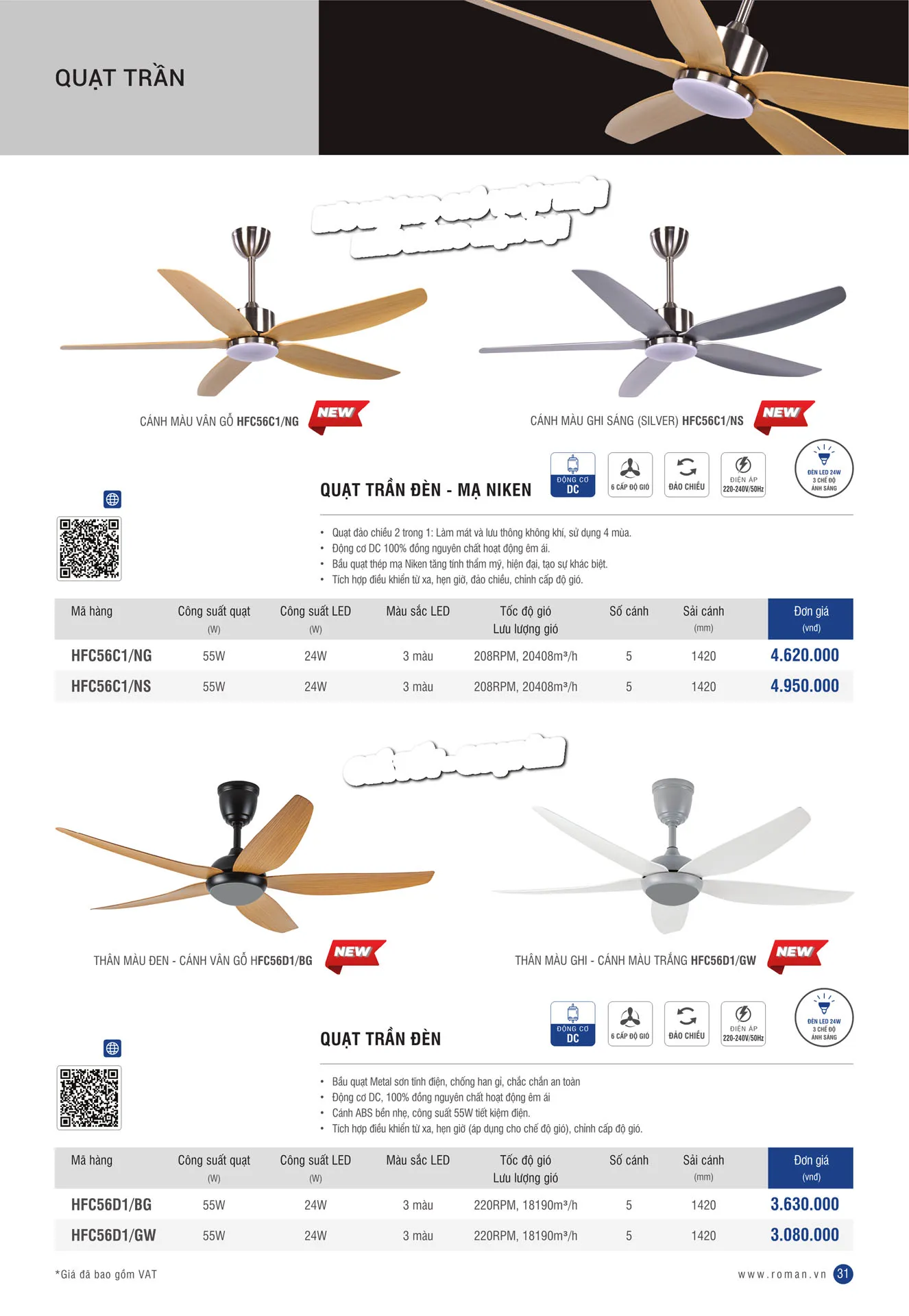 Quạt trần đèn 5 cánh Roman HFC56C1/NG Ø142cm
