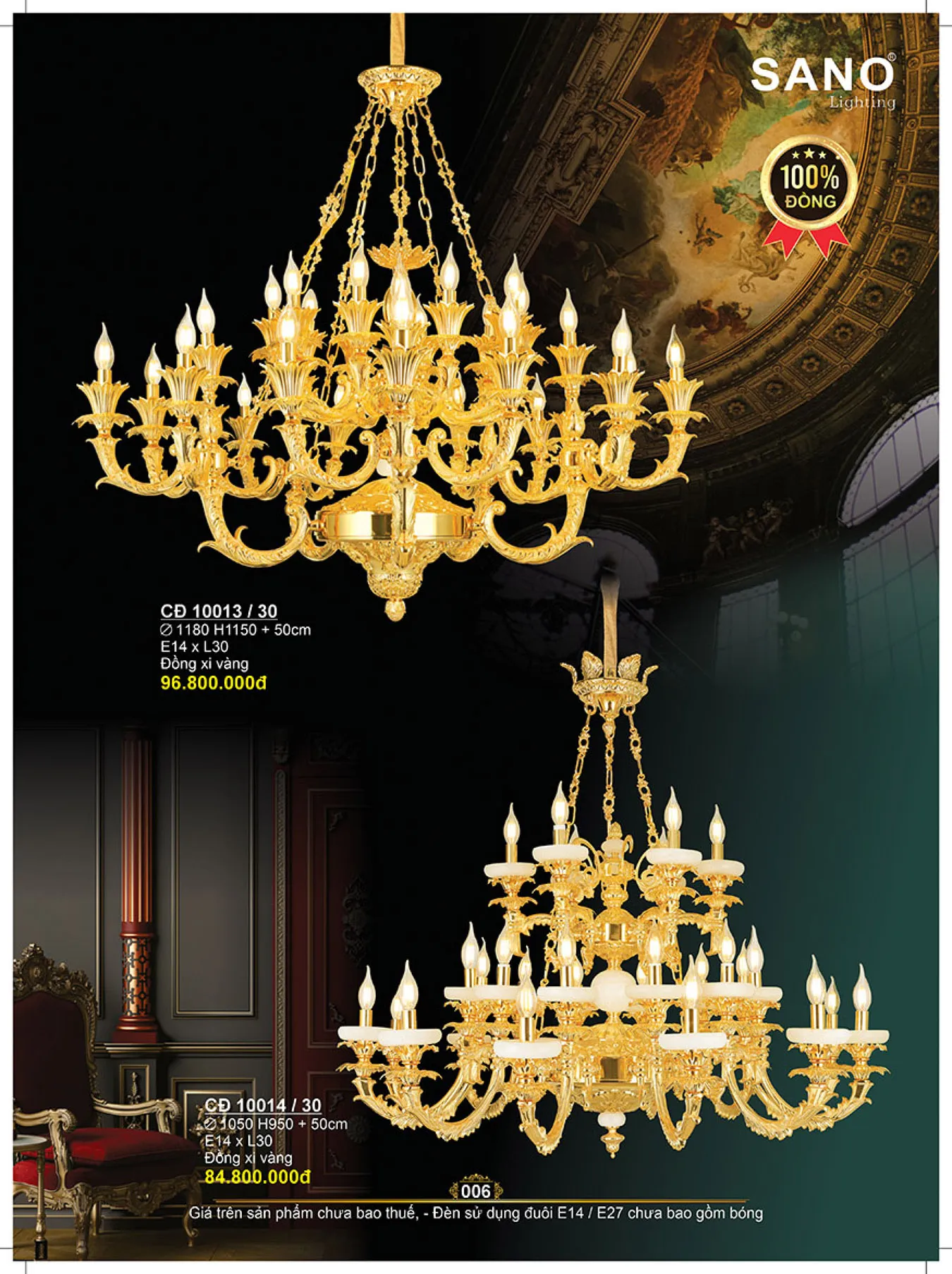 Đèn chùm đồng SANO Ø1180*H1150+50cm - E14*L30 - Đồng xi vàng