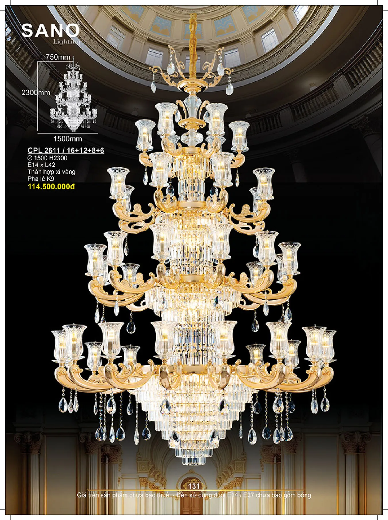 Đèn chùm pha lê K9, thân hợp xi kim mạ cao cấp SANO Ø1500*H2300 - E14*L42