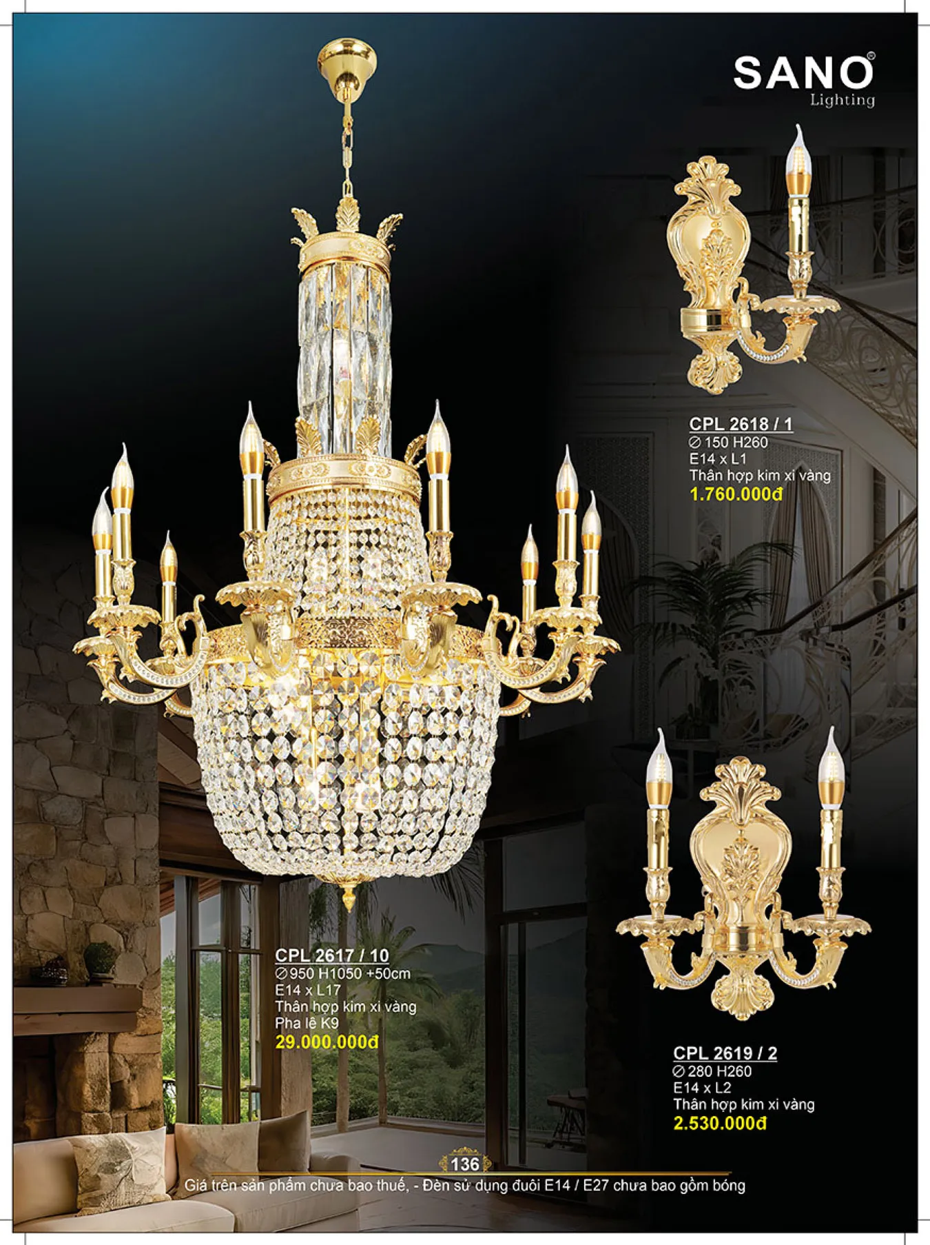 Đèn vách pha lê thân hợp kim mạ cao cấp SANO Ø280*H260 - E14*L2