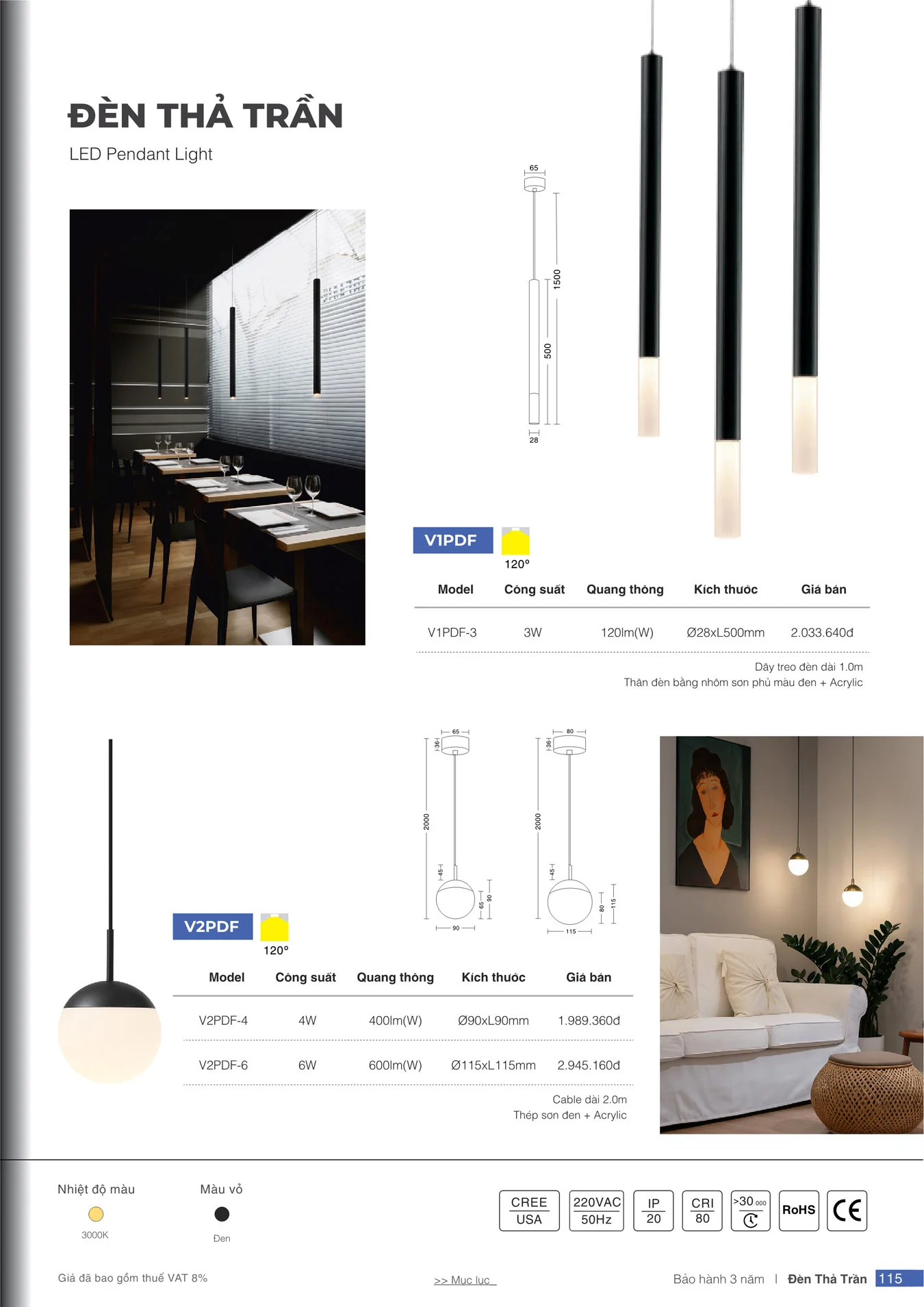 Đèn treo trần 3W VinaLED mẫu V1PDF-3