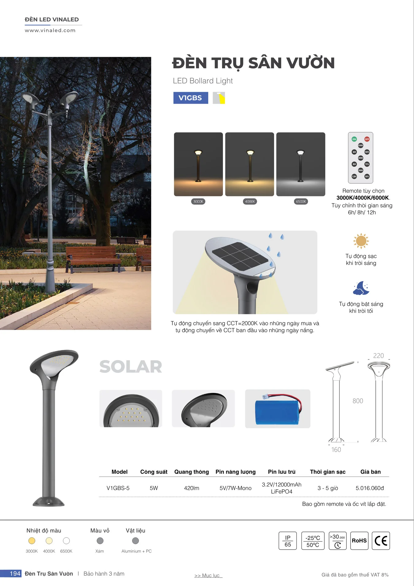 Đèn trụ sân vườn năng lượng mặt trời VinaLED 5W mẫu V1GBS-5