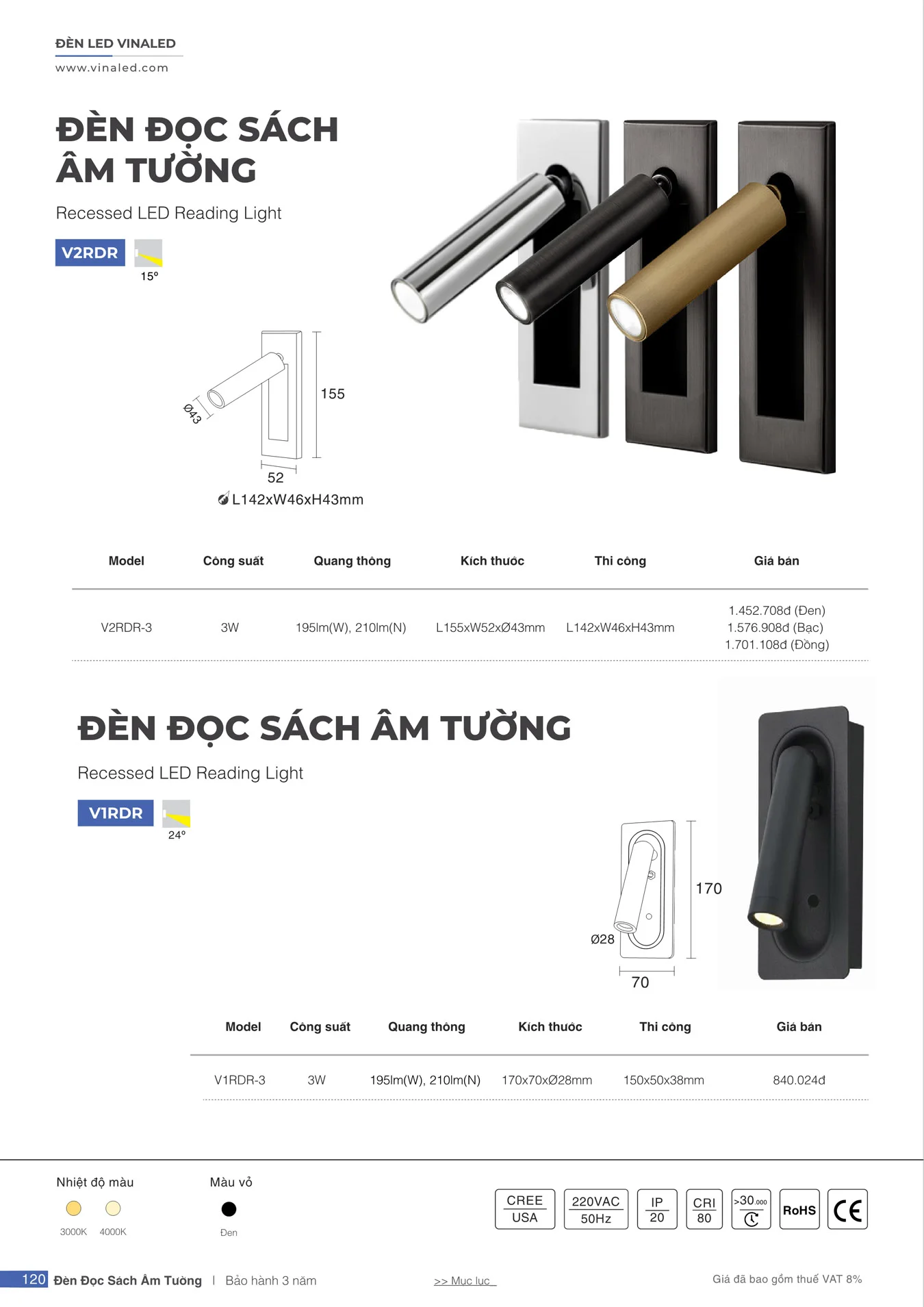 Đèn đọc sách âm tường 3W Vinaled V1RDR-3