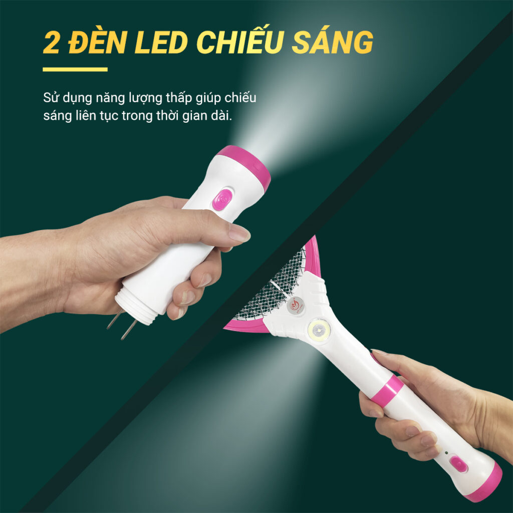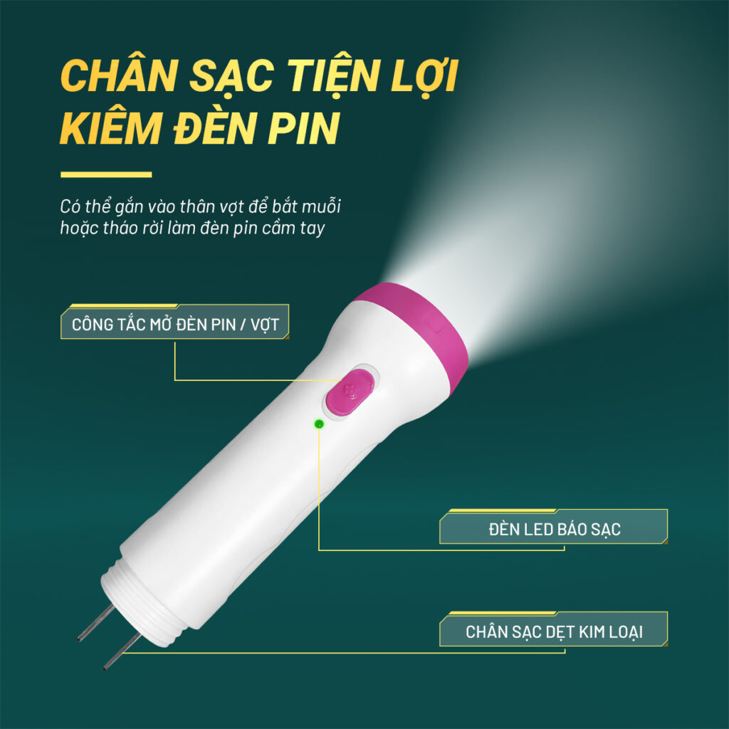 - Tay vợt tháo rời sử dụng như đèn pin